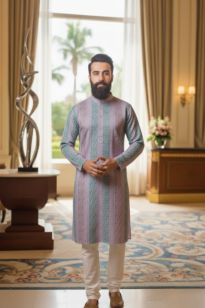 Elevate your ethnic wardrobe with this elegant Mirza Kurta, designed with a timeless pattern that blends tradition with contemporary style. Featuring a straight-cut silhouette, full sleeves, and a mandarin collar with a buttoned placket, this kurta ensures a perfect balance of comfort and sophistication. The intricate woven detailing adds a touch of refinement, making it an ideal choice for festive occasions, weddings, or formal gatherings. Pair it with classic churidar, pajama, or trousers to complete the look.