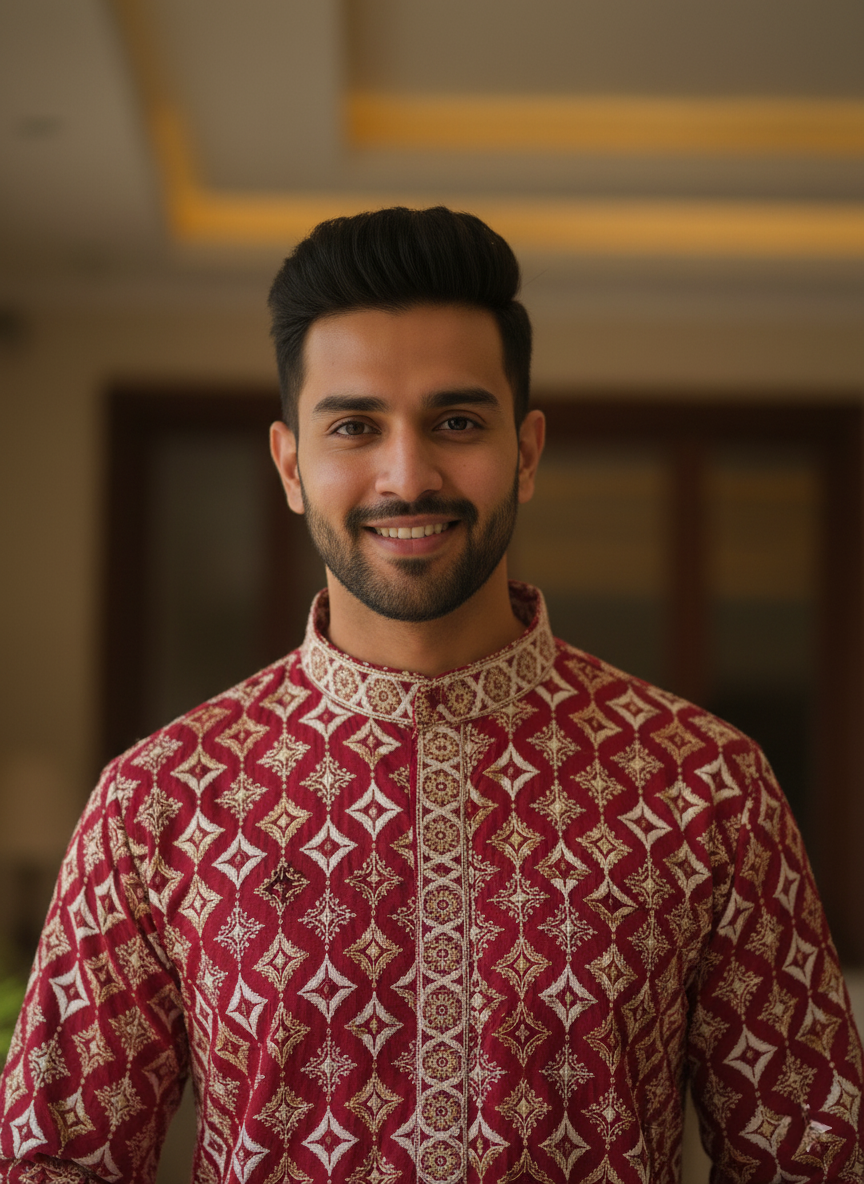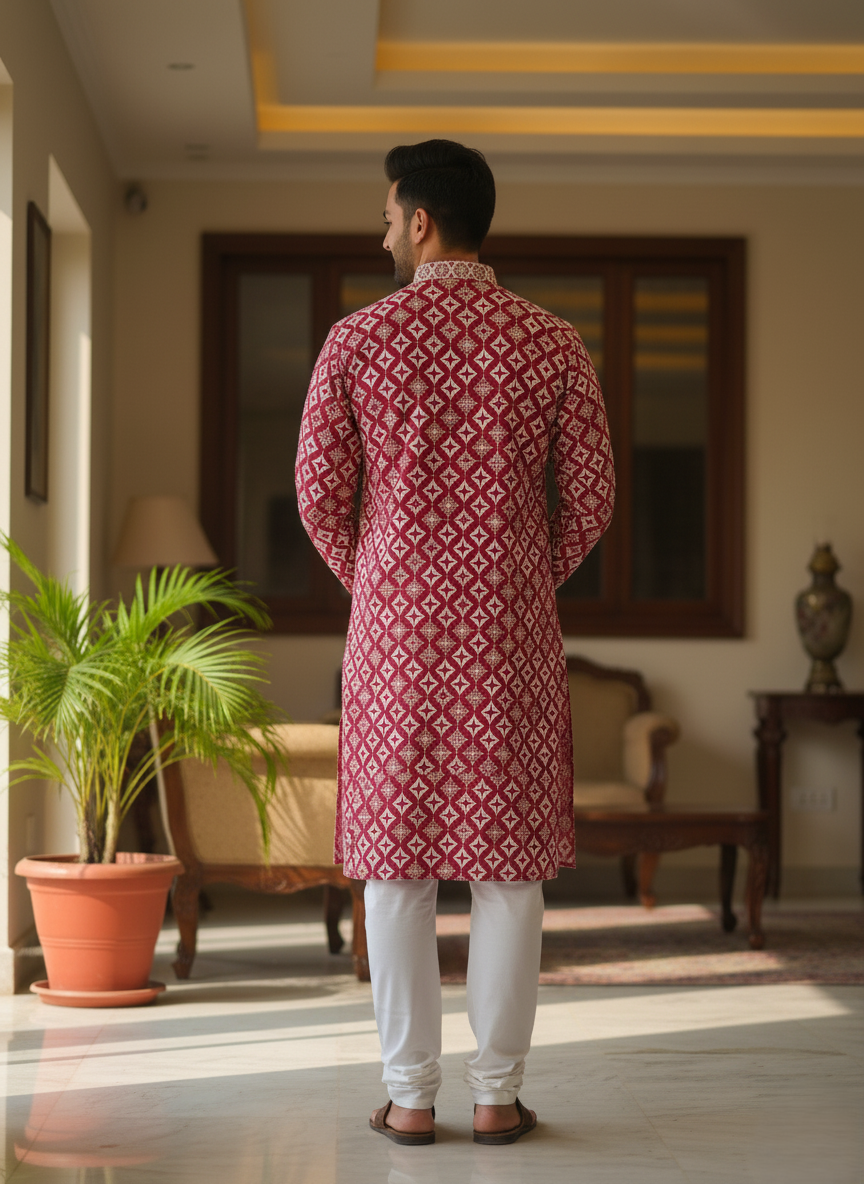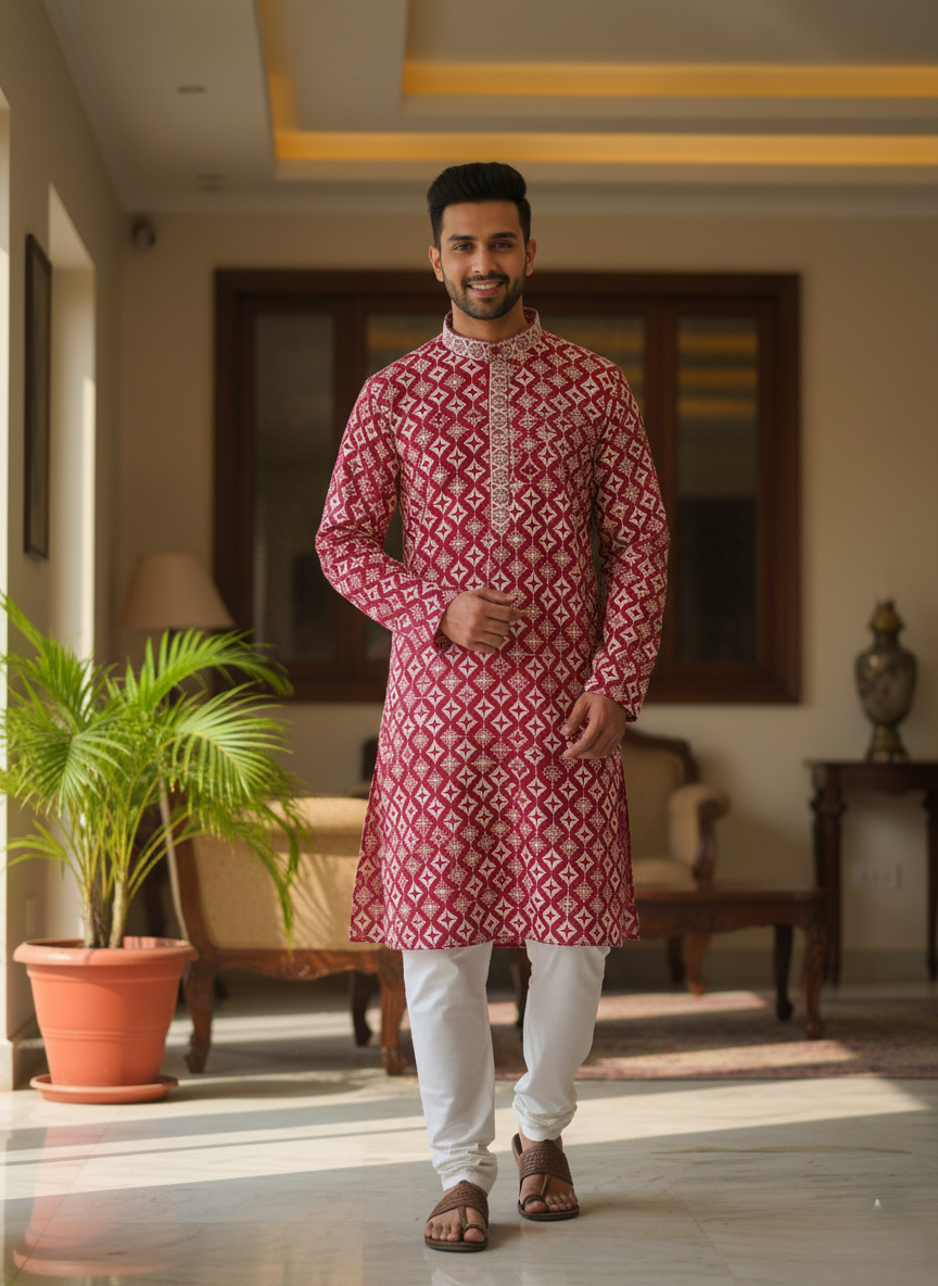 This Red cotton kurta features a striking all-over white geometric and floral embroidery pattern, creating a rich, textured look perfect for festive, semi-formal, or wedding occasions.