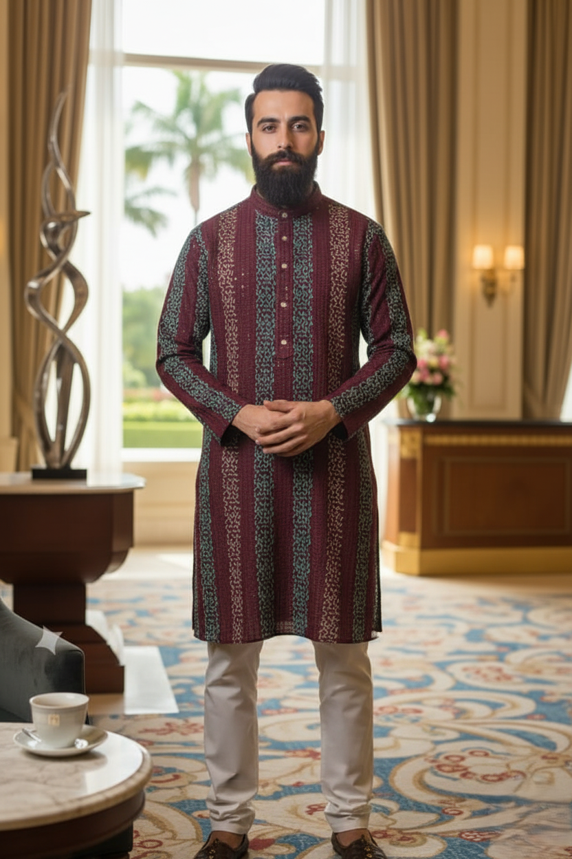 Elevate your ethnic wardrobe with this elegant Mirza Kurta, designed with a timeless pattern that blends tradition with contemporary style. Featuring a straight-cut silhouette, full sleeves, and a mandarin collar with a buttoned placket, this kurta ensures a perfect balance of comfort and sophistication. The intricate woven detailing adds a touch of refinement, making it an ideal choice for festive occasions, weddings, or formal gatherings. Pair it with classic churidar, pajama, or trousers to complete the look.