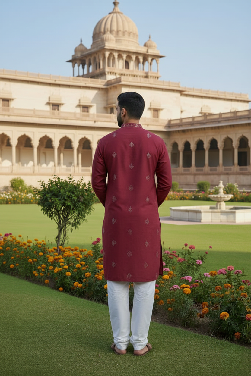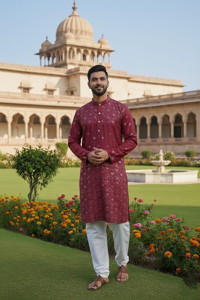 Bright Red Cotton Kurta Pajama for Men – Elegant ethnic wear perfect for weddings, festive occasions, and traditional celebrations. Comfortable fit with modern design.