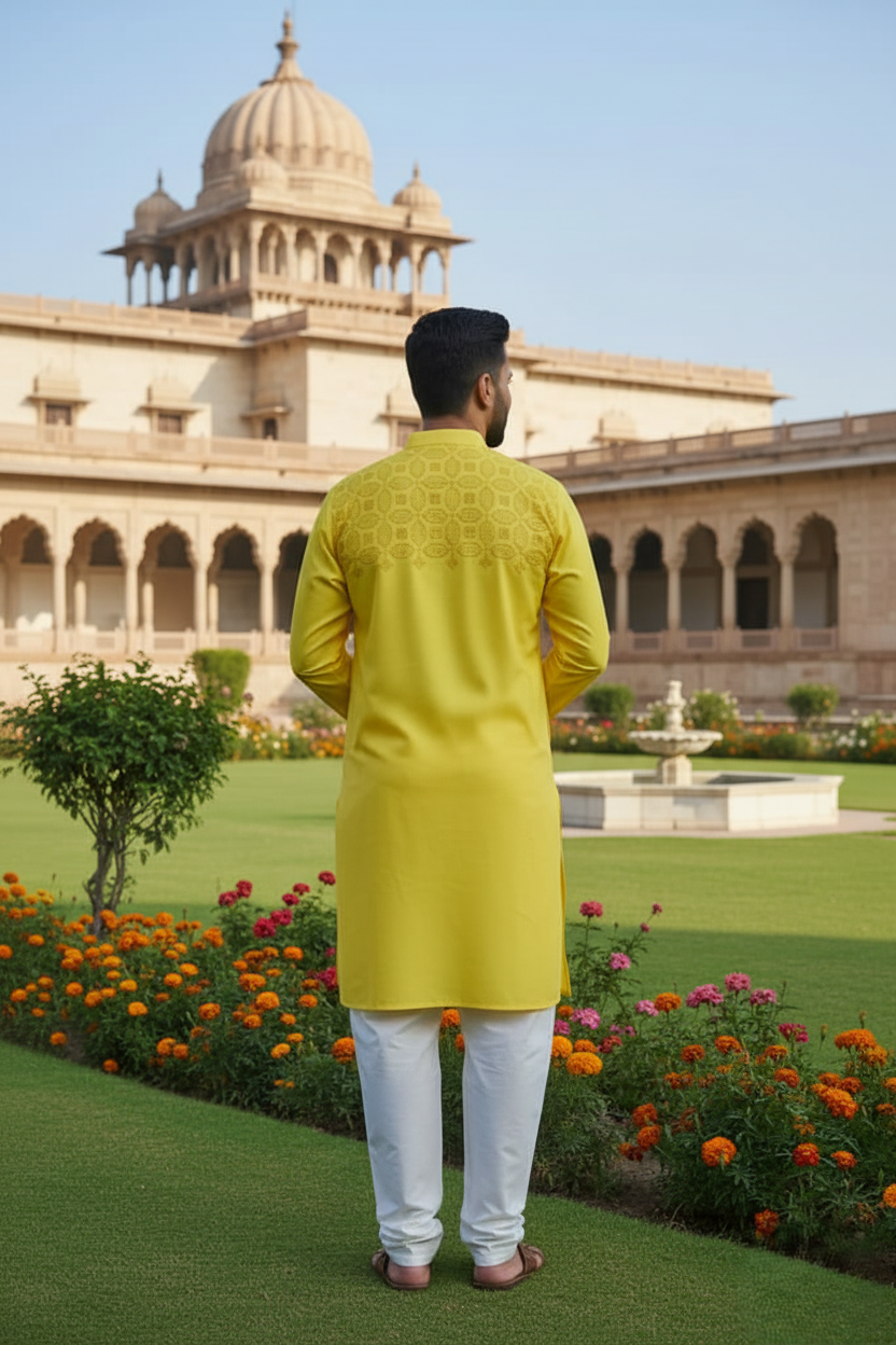 Make every occasion special with this vibrant yellow kurta pajama set for men. Crafted from premium-quality cotton, the kurta ensures a relaxed fit and breathable comfort, ideal for long celebrations. The elegant detailing on the neckline adds a festive charm, making it a perfect pick for weddings, haldi ceremonies, family gatherings, or festive events.