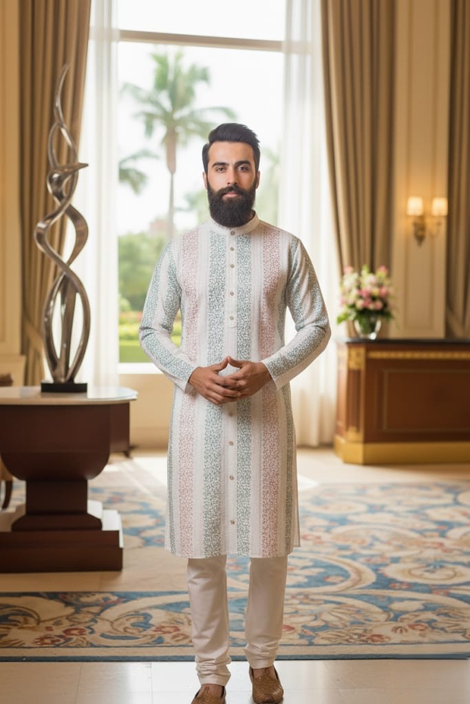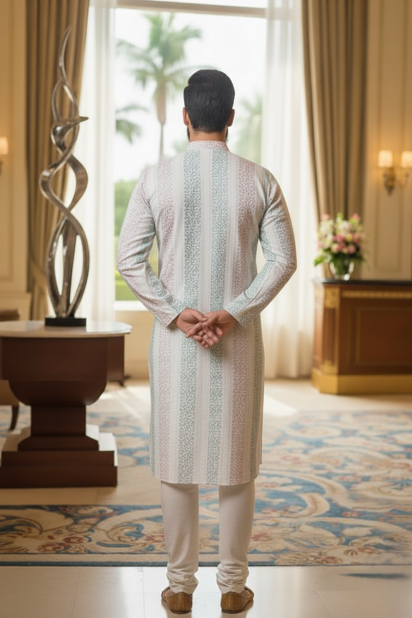 White and Green Striped Mirza Kurta & Pajama Set