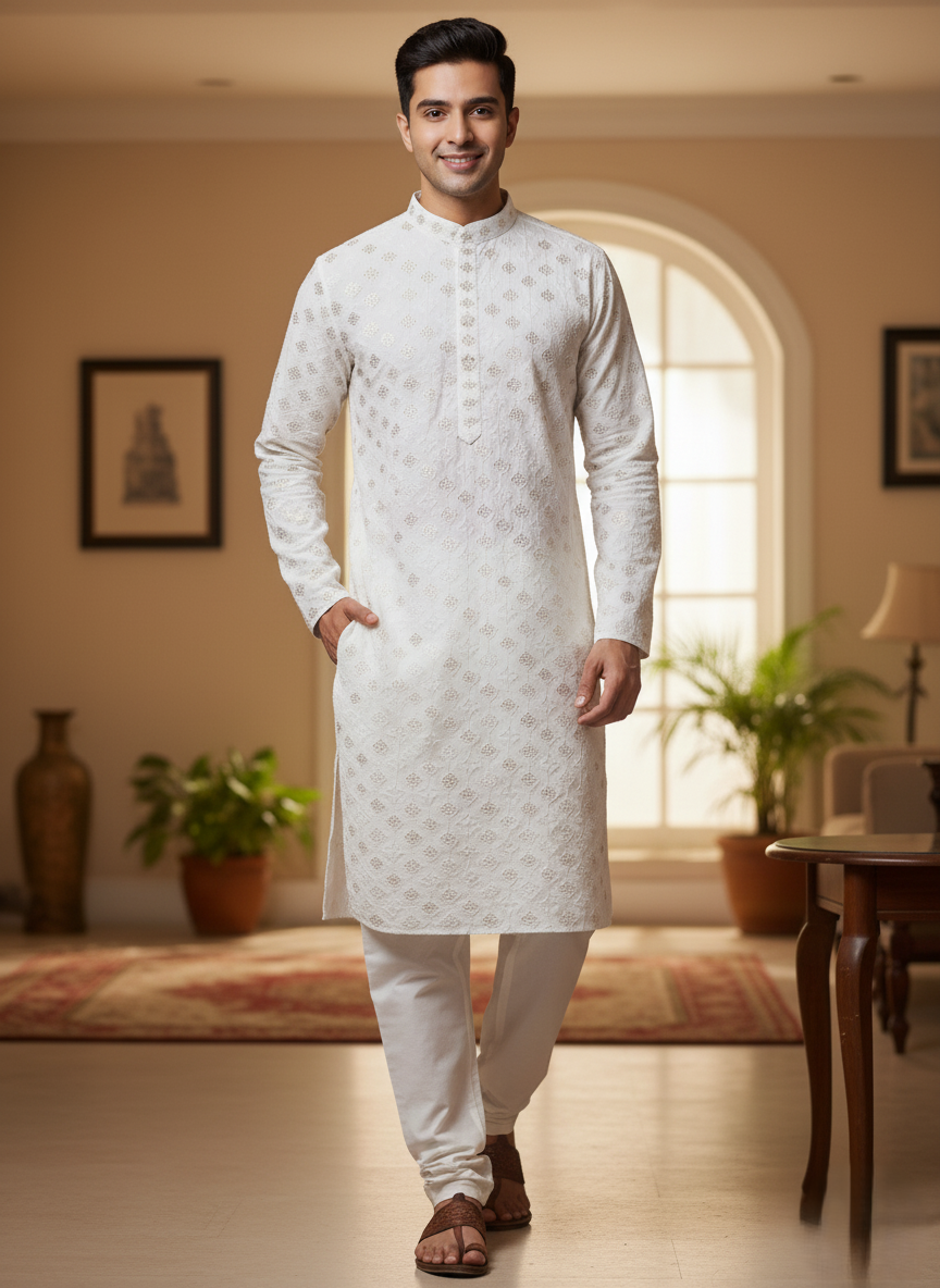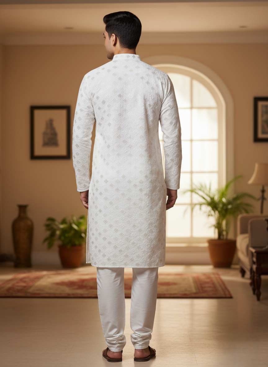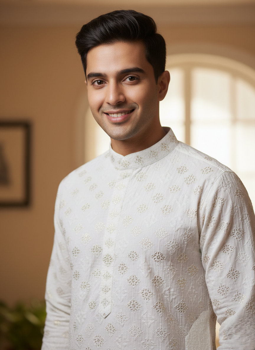This White cotton kurta features a striking all-over white geometric and floral embroidery pattern, creating a rich, textured look perfect for festive, semi-formal, or wedding occasions.