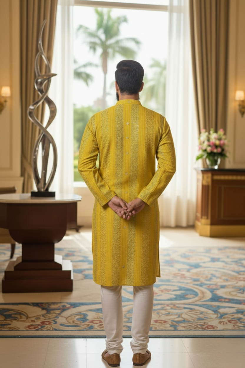 Yellow Striped Mirza Kurta & Pajama Set