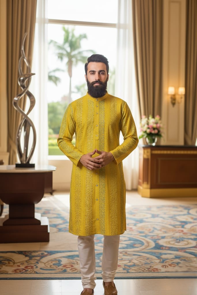 Elevate your ethnic wardrobe with this elegant Mirza Kurta, designed with a timeless pattern that blends tradition with contemporary style. Featuring a straight-cut silhouette, full sleeves, and a mandarin collar with a buttoned placket, this kurta ensures a perfect balance of comfort and sophistication. The intricate woven detailing adds a touch of refinement, making it an ideal choice for festive occasions, weddings, or formal gatherings. Pair it with classic churidar, pajama, or trousers to complete the look.